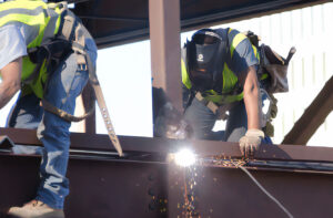 お知らせ&施工実績&事業・サービス NEWS&WORKS& BUSINESS・SERVICE BUSINESS・SERVICE 鍛冶工事・現場溶接工事 鉄骨工事では、設計と寸分の違いもなく組み上げるのに欠かせない作業が必要とされます。 鍛冶工事・現場溶接工事とは、鉄骨を設計図通りにカットする工事と鉄骨同士を半自動溶接機を用いて溶接し、設置するための工事のことです。 固定したボルト等を溶接することで緩むことをなくし、鉄骨同士が補強され、より強く安定した鉄骨へと組みあげられます。